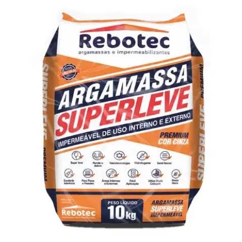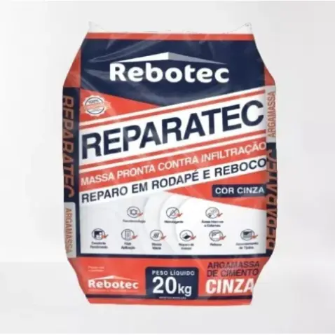 Argamassa da Rebotec perfeita para eliminar de vez os problemas de infiltração em rodapés e rebocos. Possui em sua formulação matérias-primas especiais que proporcionam boa trabalhabilidade e excelente retenção de água, que resultam em um revestimento impermeável e resistente. Disponível em embalagens de 20 e 250 kg